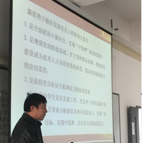 晚上7点半,机电院分党校班导师肖楚楚以“发展党员程序”为主题,为支委们详细讲述了从群众发展到正式党员的具体流程以及整个过程中所有材料的书写格式要求,肖老师还细心的提醒支委们在发展党员过程中所需要注意的问题;培训后,支委们纷纷表示,对党员的发展有了清楚的认识。