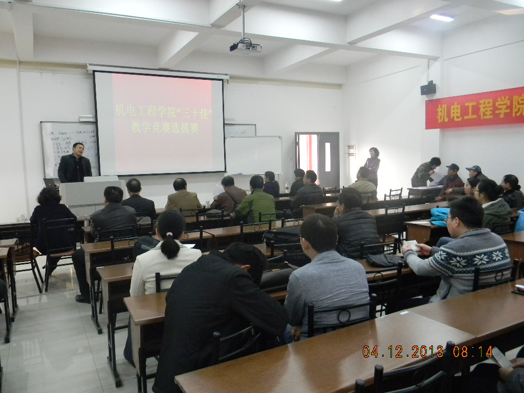 12月4日,由院部门工会和教务办联合组织的“三十佳”教学竞赛选拔赛在机电楼C座503成功举办。校工会组织部部长胡宏辉、副部长周子君应邀参加了此次活动。院党委书记兼工会主席李晓谦、院长黄明辉、副院长张怀亮非常重视此次活动并亲临现场认真观摩了选手的比赛。此次比赛由刘世勋、周国荣、刘舜尧、夏建芳、杨放琼5位老师担任评委,来自各系所的20名青年教师为此次比赛做了精心准备,本次活动由院工会常务副主席吴纯主持,院长助理云忠宣读了比赛规则和评分标准。