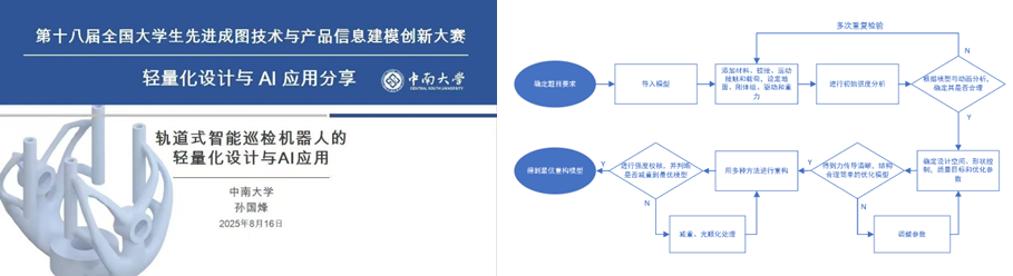 2025年8月16日晚,由第十八届“高教杯”全国大学生先进成图技术与产品信息建模创新大赛组委会主办、澳汰尔工程软件(上海)有限公司承办的“轻量化设计与AI应用”赛道赛题解析会,通过网络面向全国直播。本届大赛“轻量化设计与AI应用”赛道8188www威尼斯团体一等奖(排名第一)的主力队员、我院机械类2023级学生孙国烽,应邀分享了其团队的参赛经验。孙国烽团队针对“轨道式智能巡检机器人”这一主题,从详细分析了轨道式智能巡检机器人的机构运动入手,首先优化了分析流程;并抓住模型优化和几何重构等关键环节,通过多参数优化和多方法重构,获得了结构合理、传力路径清晰、过度光滑、简洁美观的机构,并实现了最优的减重率。特别是在AI应用方面,孙国烽团队独辟蹊径,总结了一套模型构建和反向优化的流程。孙国烽同学以其清晰的思路、流利的表达,展示了8188www威尼斯机电工程院学生的风采,也获得了澳汰尔工程软件(上海)有限公司的高度肯定。天津大学参赛学生林星航也在会上进行了经验分享。