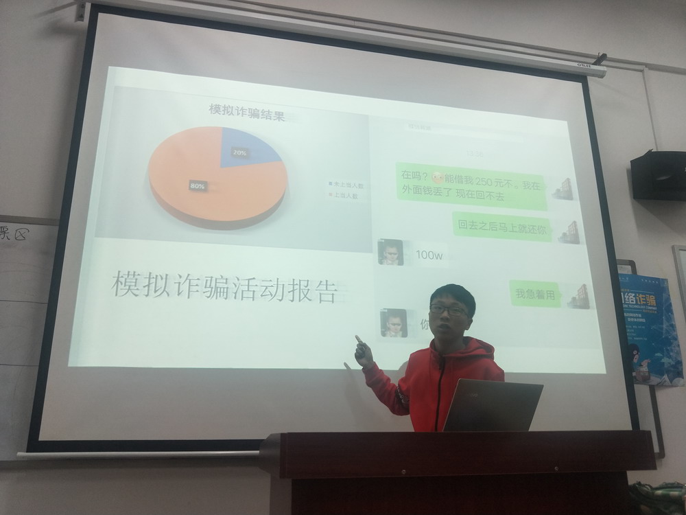 主持人先用PPT简要为同学们讲述了近年来主要的诈骗手段和诈骗趋势,接下来,活动前被通知扮演“骗子”的同学上台为大家讲述自己的“诈骗过程”和同学们的反应。有些同学丝毫没有怀疑就上当了,而有的则表现得稳重许多。总结下来可概括为:有事当面说,时刻不放松。